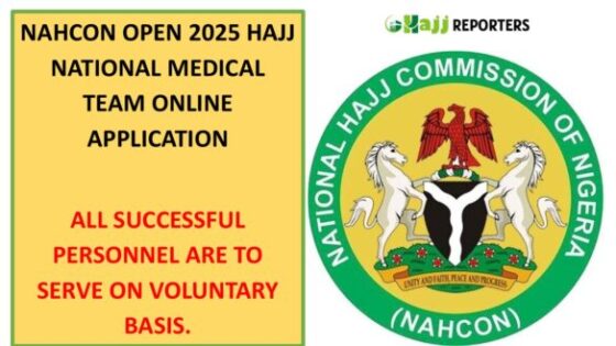 The National Hajj Commission of Nigeria (NAHCON) is pleased to announce the commencement of online application for 2025 Hajj National Medical Team (NMT). Medical Doctors, Pharmacists, Nurses and Environment / Community Health Officers (CHO/EHO) are the only professionals needed.