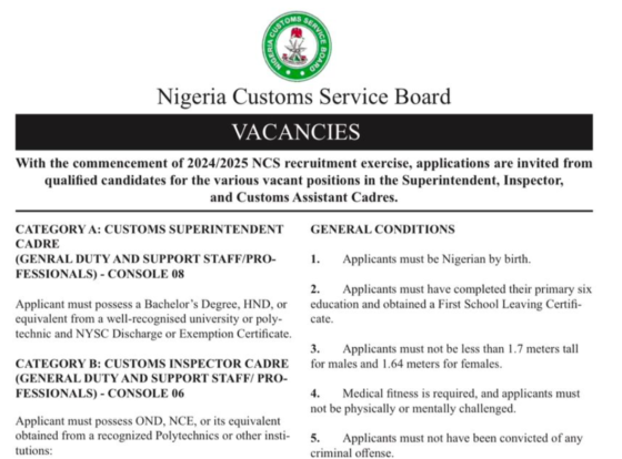 The Nigeria Customs Service (NCS) announces job vacancies for the position of Customs Assistant Cadre across the country. Interested applicants must meet all the requirements before the application deadline, January 2, 2025.