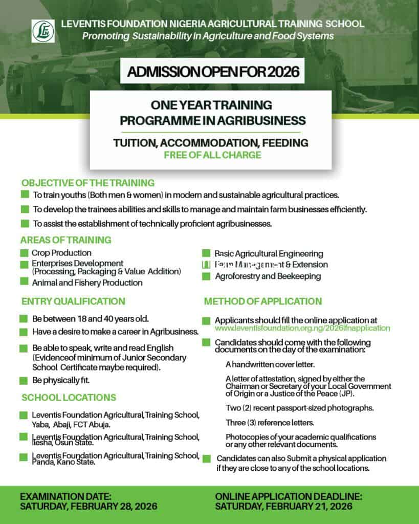 The post Apply Now: Leventis Foundation Nigeria – One Year Training programme in agribusiness 2026 appeared first on Advert By Dotifi .Com Domains for almajiri.com.ng | Best African Hausa Music Blog, Entertainment ,News and Gossips .