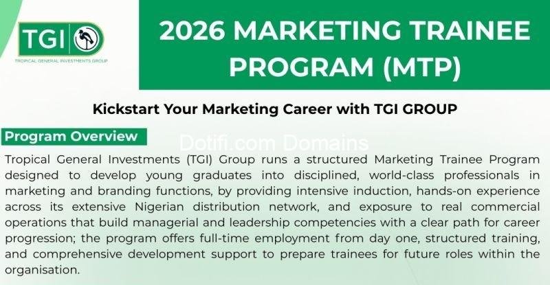 Tropical General Investments (TGI) Group runs a structured Marketing Trainee Program designed to develop young graduates into disciplined, world-class professionals in marketing and branding functions, by providing intensive induction, hands-on experience across its extensive Nigerian distribution network, and exposure to real commercial operations that build managerial and leadership competencies with a clear path for career progression; the program offers full-time employment from day one, structured training, and comprehensive development support to prepare trainees for future roles within the organisation.